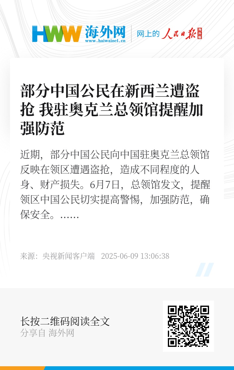 近期,部分中国公民向中国驻奥克兰总领馆反映在领区遭遇盗抢,造成不同程度的人身、财产损失。6月7日,总领馆发文,提醒领区中国公民切实提高警惕,加强防范,确保安全。