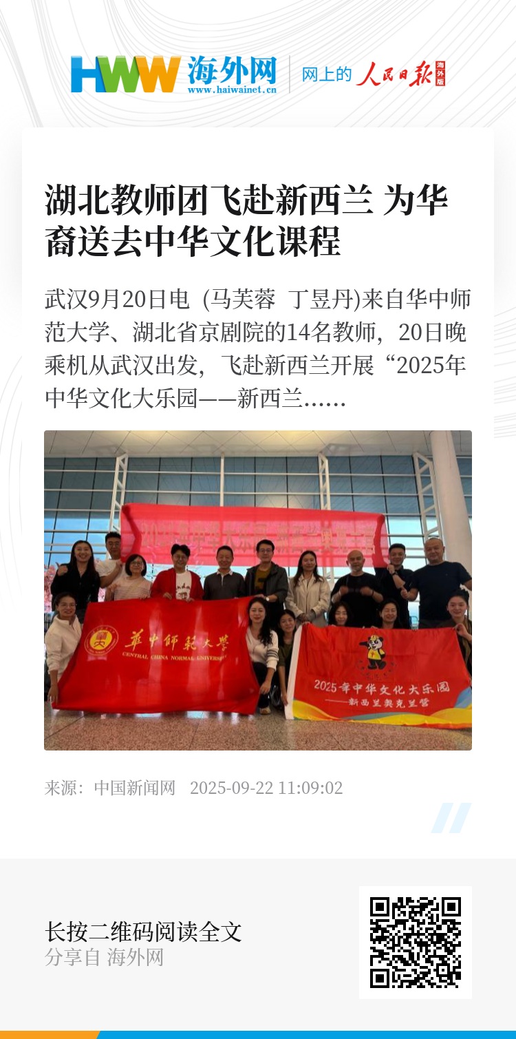 中新网武汉9月20日电 (马芙蓉 丁昱丹)来自华中师范大学、湖北省京剧院的14名教师,20日晚乘机从武汉出发,飞赴新西兰开展“2025年中华文化大乐园——新西兰奥克兰营”活动。