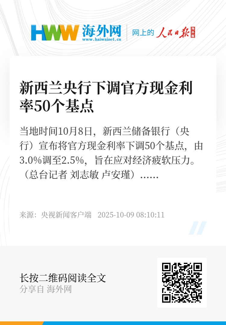 当地时间10月8日,新西兰储备银行(央行)宣布将官方现金利率下调50个基点,由3.0%调至2.5%,旨在应对经济疲软压力。(总台记者 刘志敏 卢安瑾)