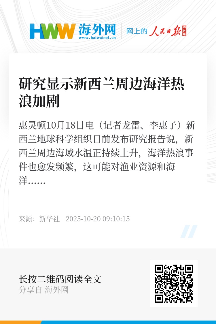 新华社惠灵顿10月18日电(记者龙雷、李惠子)新西兰地球科学组织日前发布研究报告说,新西兰周边海域水温正持续上升,海洋热浪事件也愈发频繁,这可能对渔业资源和海洋生态系统造成显著影响。