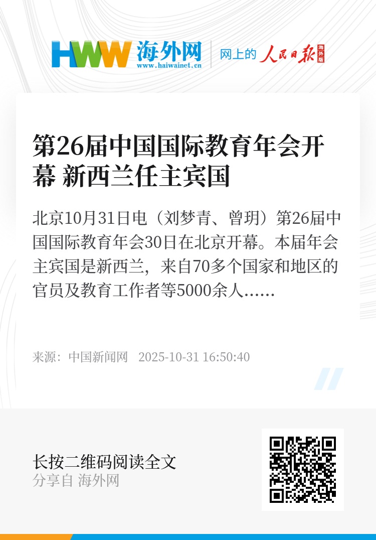 中新网北京10月31日电(刘梦青、曾玥)第26届中国国际教育年会30日在北京开幕。本届年会主宾国是新西兰,来自70多个国家和地区的官员及教育工作者等5000余人参会。