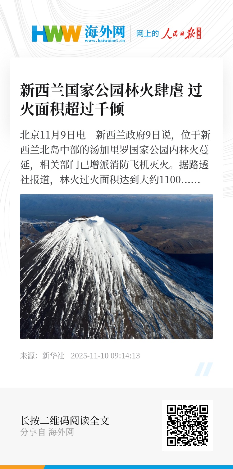新华社北京11月9日电 新西兰政府9日说,位于新西兰北岛中部的汤加里罗国家公园内林火蔓延,相关部门已增派消防飞机灭火。据路透社报道,林火过火面积达到大约1100公顷。