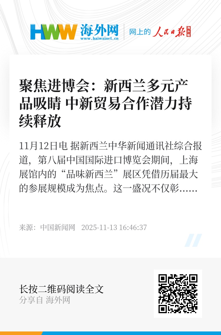 进博会这一开放包容的平台,不仅成为新西兰企业展示自信与品质的最佳窗口,更推动新中经贸合作迈向更高层次的共赢新阶段——“从贸易伙伴到命运共同体”的深化合作新格局。进博会也为世界呈现了充满信任与希望的合作范例,真正实现“新中共赢,世界共享”。