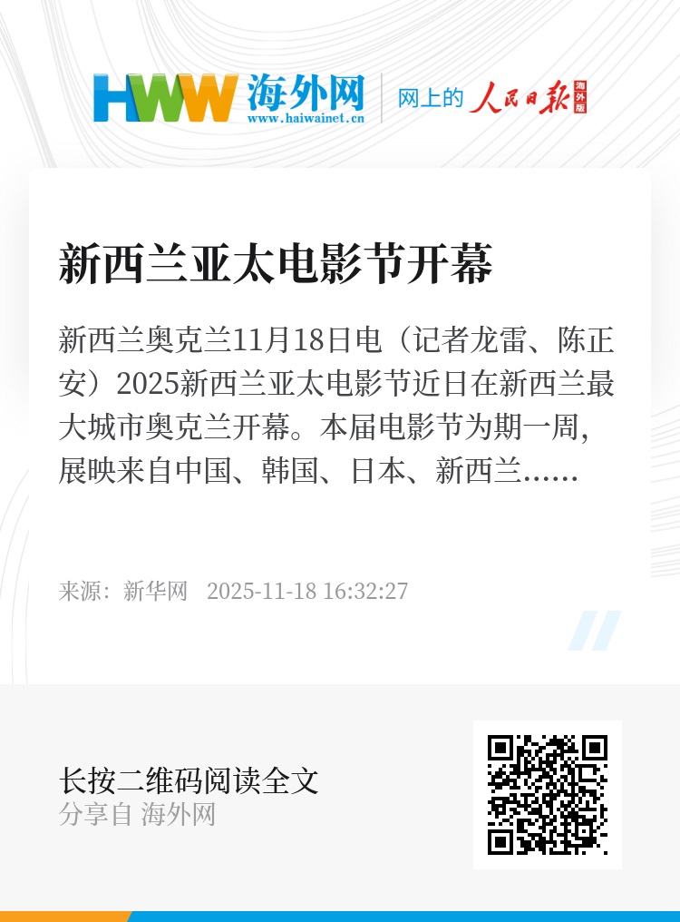 新华网新西兰奥克兰11月18日电(记者龙雷、陈正安)2025新西兰亚太电影节近日在新西兰最大城市奥克兰开幕。本届电影节为期一周,展映来自中国、韩国、日本、新西兰等国的16部电影。