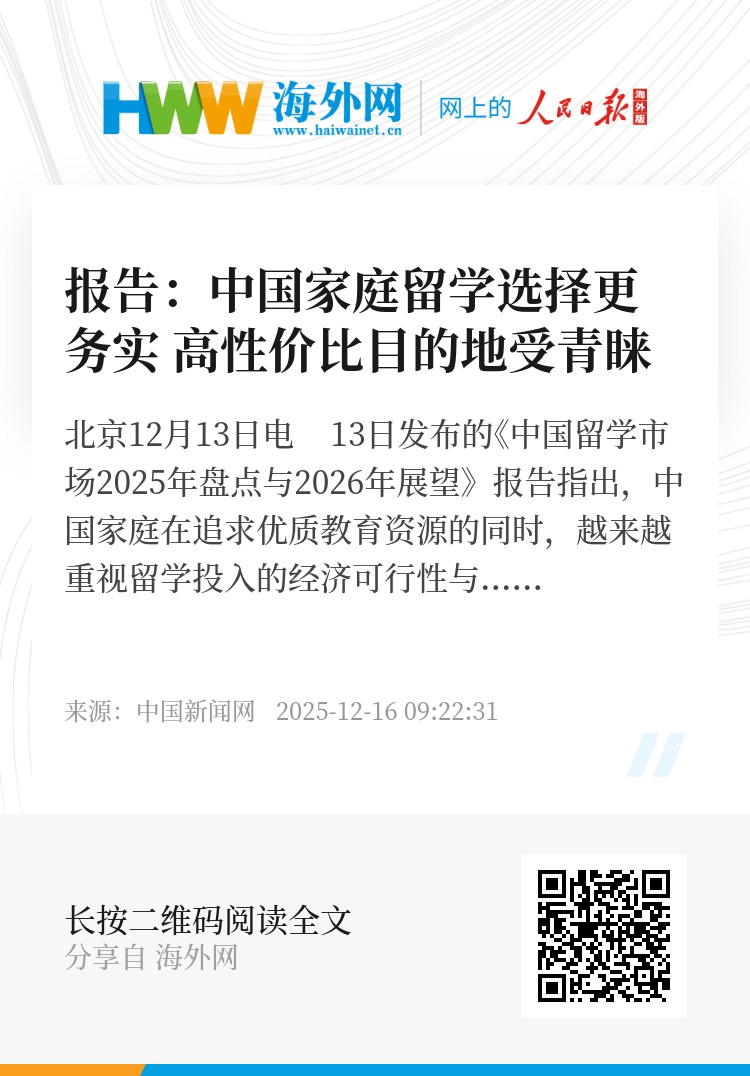中新网北京12月13日电 13日发布的《中国留学市场2025年盘点与2026年展望》报告指出,中国家庭在追求优质教育资源的同时,越来越重视留学投入的经济可行性与长期回报。政策相对稳定、性价比更高的欧亚地区正受到更多关注。