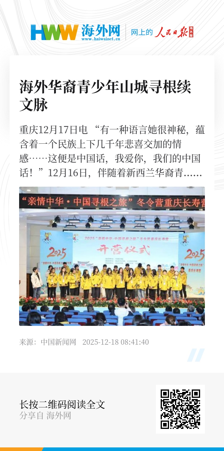 中新网重庆12月17日电 “有一种语言她很神秘,蕴含着一个民族上下几千年悲喜交加的情感……这便是中国话,我爱你,我们的中国话!”12月16日,伴随着新西兰华裔青少年饱含深情的诗朗诵,2025“亲情中华·中国寻根之旅”冬令营重庆长寿营在长寿中学正式开营。