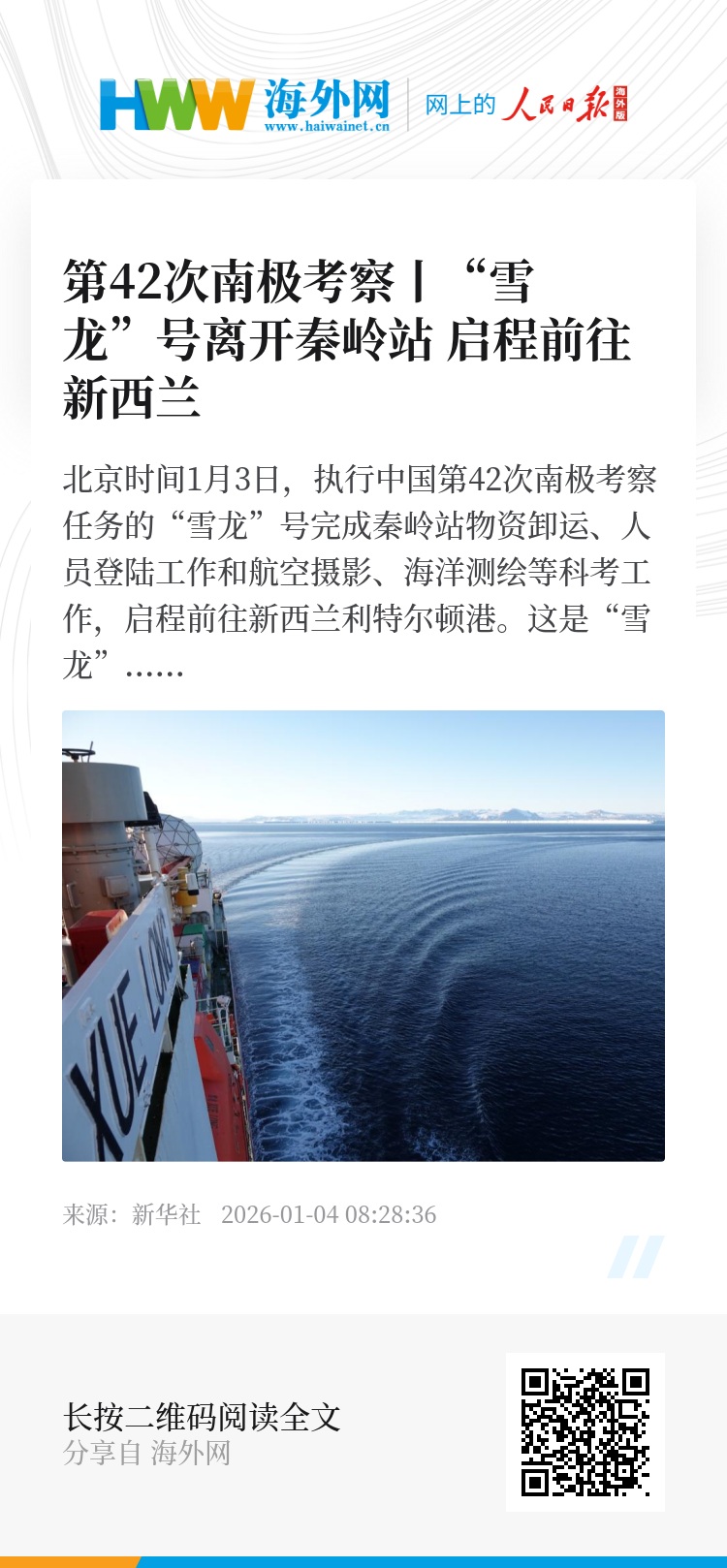 新华社“雪龙”号1月3日电(记者顾天成)北京时间3日,执行中国第42次南极考察任务的“雪龙”号完成秦岭站物资卸运、人员登陆工作和航空摄影、海洋测绘等科考工作,启程前往新西兰利特尔顿港。