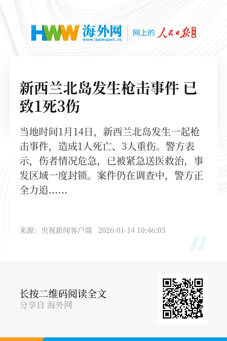当地时间1月14日,新西兰北岛发生一起枪击事件,造成1人死亡、3人重伤。