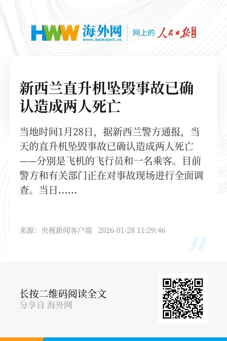 当地时间1月28日,据新西兰警方通报,当天的直升机坠毁事故已确认造成两人死亡——分别是飞机的飞行员和一名乘客。目前警方和有关部门正在对事故现场进行全面调查。