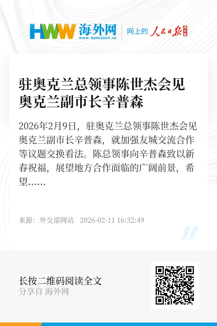 2026年2月9日,驻奥克兰总领事陈世杰会见奥克兰副市长辛普森,就加强友城交流合作等议题交换看法。