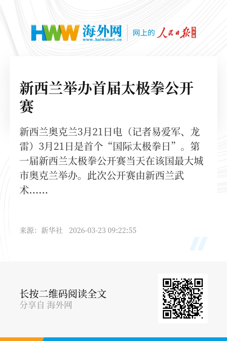 新华社新西兰奥克兰3月21日电(记者易爱军、龙雷)3月21日是首个“国际太极拳日”。第一届新西兰太极拳公开赛当天在该国最大城市奥克兰举办。