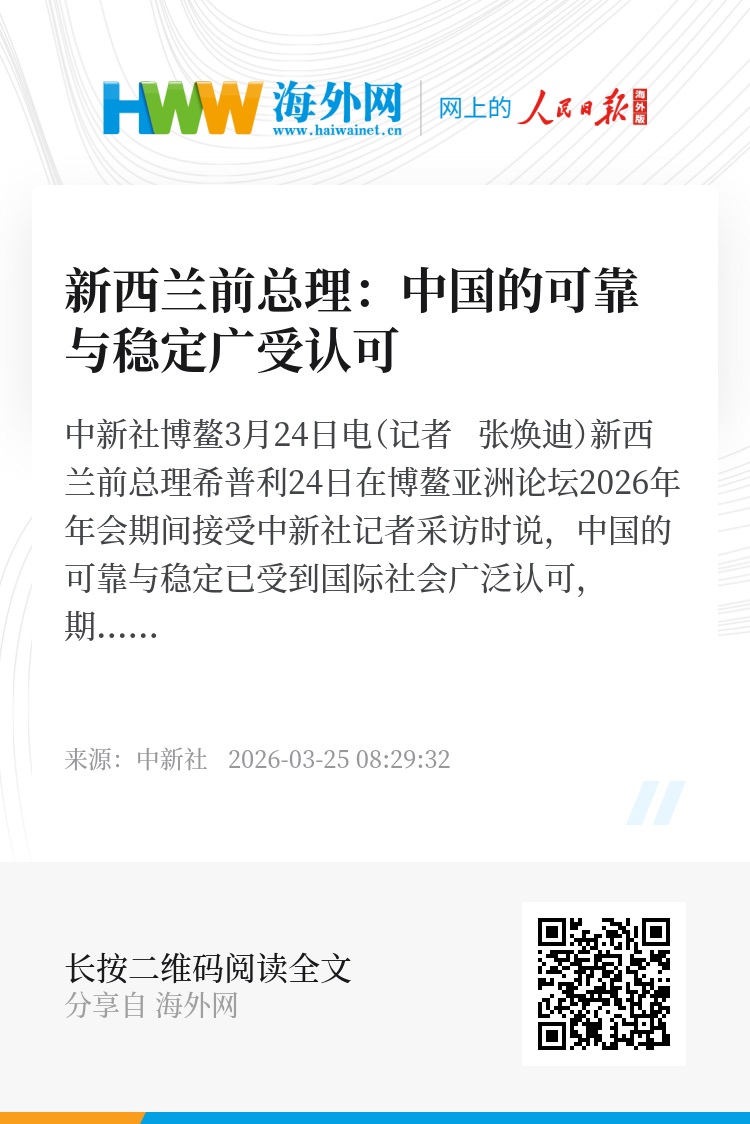 中新社博鳌3月24日电(记者 张焕迪)新西兰前总理希普利24日在博鳌亚洲论坛2026年年会期间接受中新社记者采访时说,中国的可靠与稳定已受到国际社会广泛认可,期待中方继续坚定发声,为世界注入稳定性。