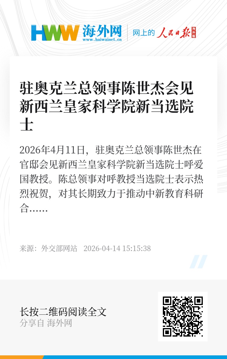 2026年4月11日,驻奥克兰总领事陈世杰在官邸会见新西兰皇家科学院新当选院士呼爱国教授。