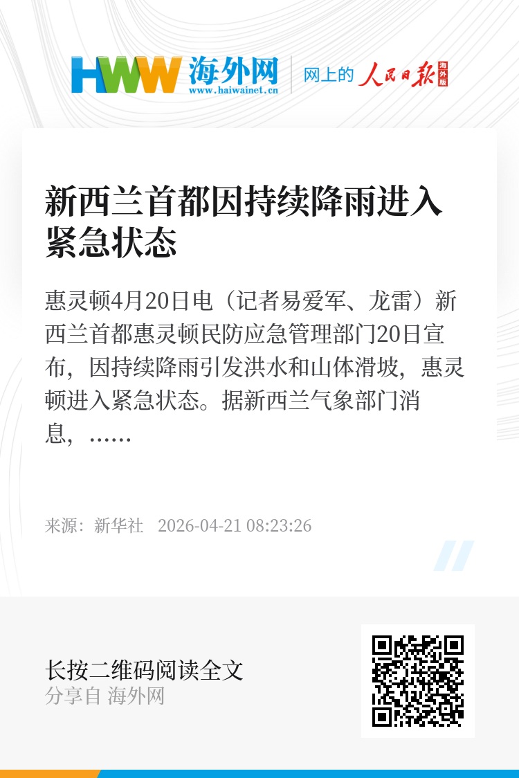 新华社惠灵顿4月20日电(记者易爱军、龙雷)新西兰首都惠灵顿民防应急管理部门20日宣布,因持续降雨引发洪水和山体滑坡,惠灵顿进入紧急状态。